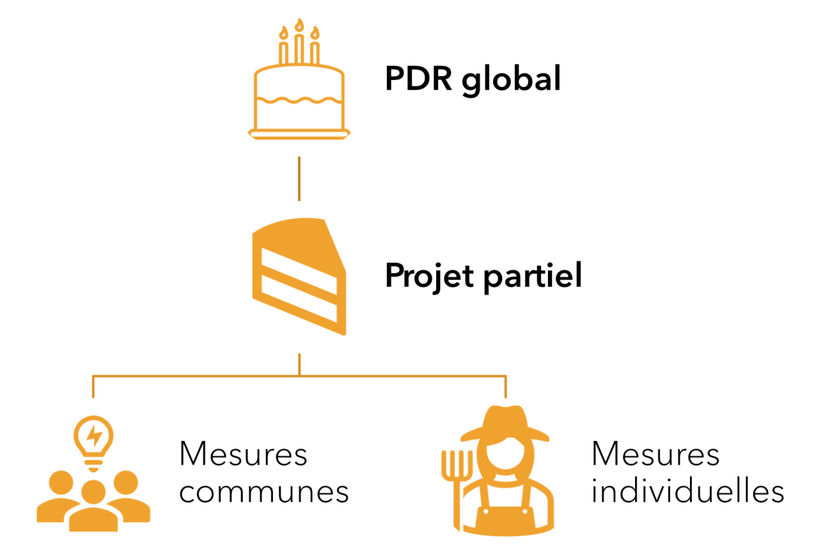 Un PDRa doit être composé d’au moins 3 projets partiels avec des objectifs différents (thèmes, par ex: filière du lait). Ces projets partiels sont composés de projets communs regroupant les agriculteurs, agricultrices, viniculteurs et vinicultrices entre elles et eux ou les liants à d’autres acteurs et actrices de la région (par ex: une laiterie gérée par une coopérative de producteurs et productrices). Ils peuvent aussi contenir des projets personnels des agriculteurs et agricultrices ou d’autres acteurs et actrices mais dont les agriculteurs et agricultrices sont les principaux bénéficiaires (par ex: développement d’une activité d’agrotourisme).